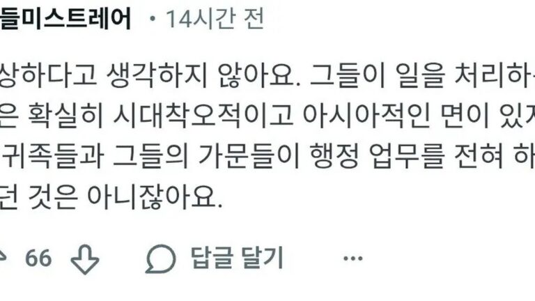 “한국인들에게 ‘귀족이 일을 안 한다’는 건 곧 ‘나라가 망한다’는 뜻으로 들려요. 세종대왕님도 야근을 하셨는데, 일개 공작이 어디서 감히 놀려고 합니까?” – 더쿠(theqoo) 이용자 댓글