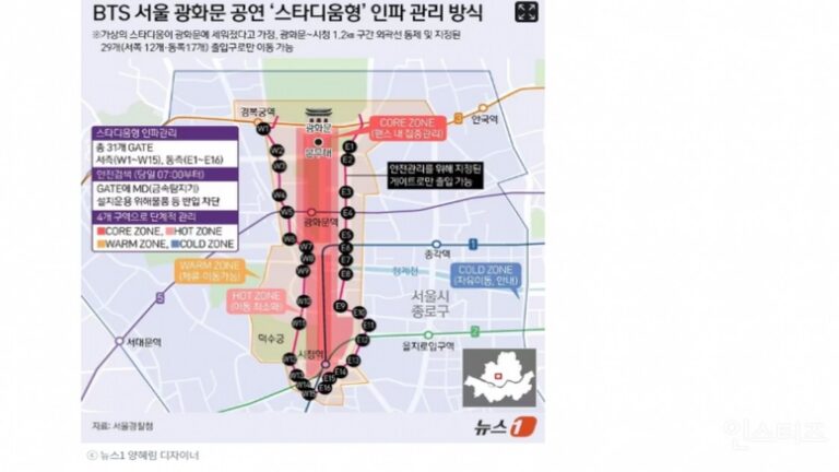 According to an official statement released by the Seoul Metropolitan Police on March 15, the area surrounding Gwanghwamun Square and Sejong-daero will be completely enclosed using high-strength fencing. This perimeter is designed to replicate the entry and exit controls of a professional sports stadium. Unlike previous open-air festivals where crowds could flow freely from side streets, this event will restrict access to 31 designated gates. Each gate will serve as a checkpoint to monitor density levels in real-time and prevent the dangerous overcrowding that can occur in unrestricted urban spaces.